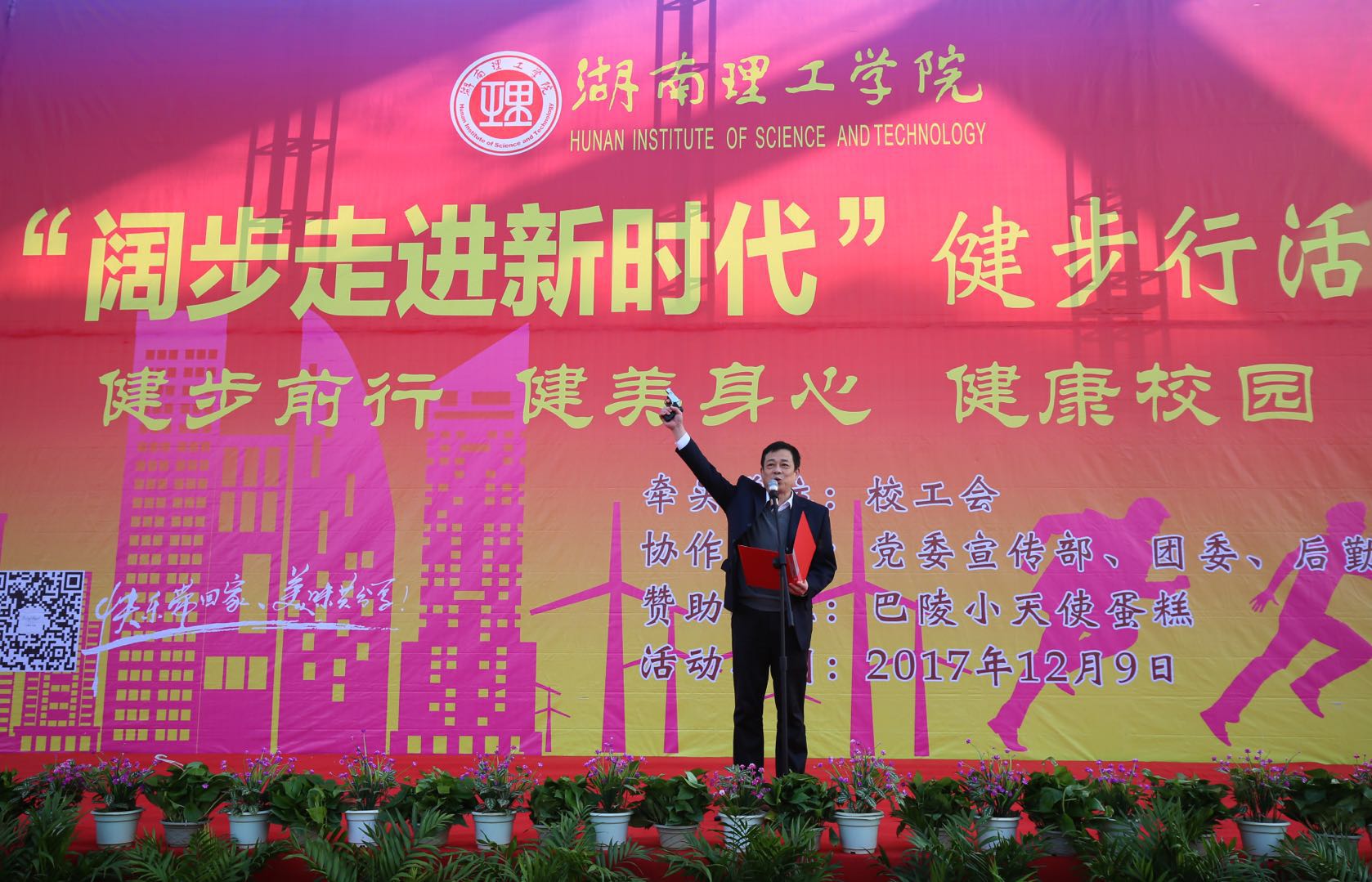 2017年12月9日,由湖南理工学院工会组织主办的全校教职工健步行活动开幕仪式在学校田径场举行,比赛分健步组和技术组在环南湖三圈从体育馆分南北两个方向进行,全长10公里,共有1100余名教职工代表参加。