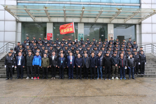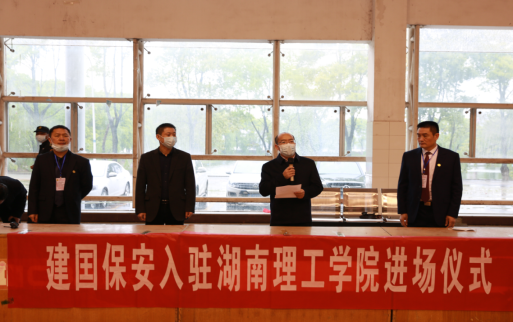保卫处处长姜剑鸣在进驻仪式上首先对学校情况和保安工作内容进行了说明,明确提出安保服务量化考核管理指标,保卫处将对安保服务情况进行月底考核,根据工作表现量化打分。随后湖南建囯保安有限公司董事长蔡建国做表态发言,他表示一定会严格按照校方要求对保安队伍进行管理,对于校园日常巡逻横向到边、纵向到底,不留死角。他要求所有保安人员在保安队伍负责人的带领下,配合好学校各项工作,坚决服从学校安排,听从指挥,做到高标准、严要求,形成新规范,全力提升工作水准,落实好学校安全保障任务。