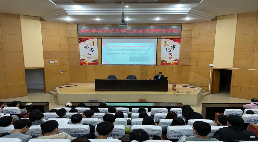 3月23日晚,保卫处副处长谭良机在综合楼学术报告厅为南湖学院外贸系开展了一堂学生安全纪律教育讲座。讲座由外贸系辅导员蒋鑫主持,全体党员和学生干部参加。