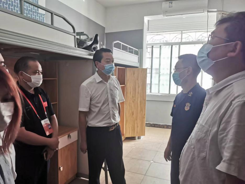 黄伟雄一行在学校应急报警指挥中心屏幕察看了校园公共场所及重点部位布防监控画面,然后实地走访了学生食堂、危化品仓库、学生宿舍,并且现场随机抽查了工作人员对消防器材的使用情况,查看了学生食堂进货、食品留样台账,危化品仓库危化品的进货、储存、使用、废弃台账,检查了学生宿舍消防设备设施和疏散通道。要求随队各业务部门从专业角度点评。