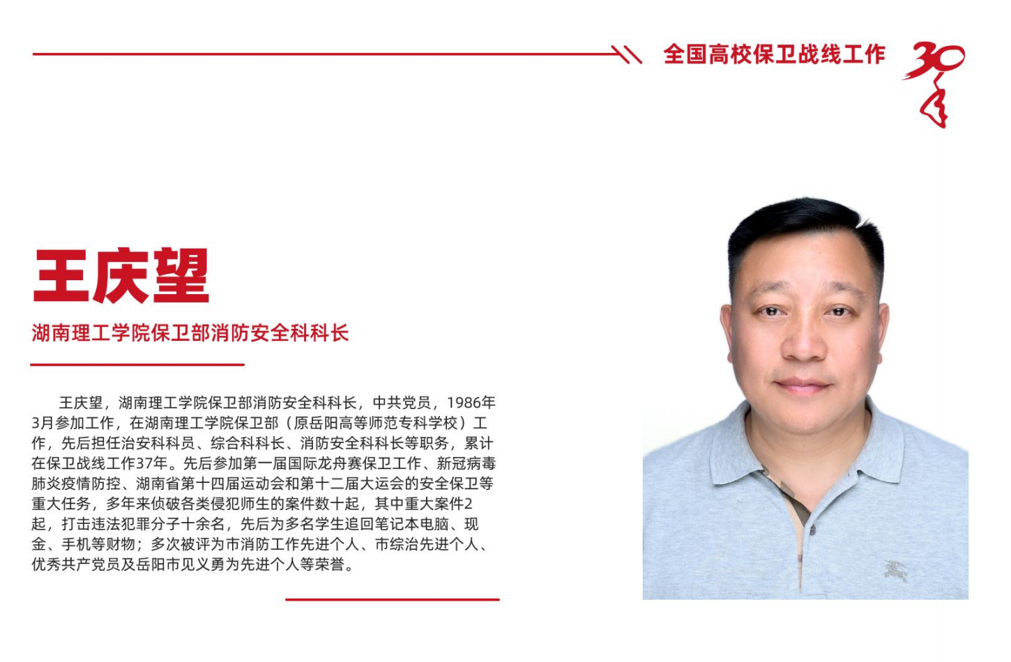 本次活动以“三十而励 勇毅前行”为主题,旨在弘扬坚守高校保卫战线满30年人物的精神品质,号召全国高校保卫工作者进一步担当作为、守正创新、砥砺奋进,为推进国家安全体系与能力现代化贡献力量。