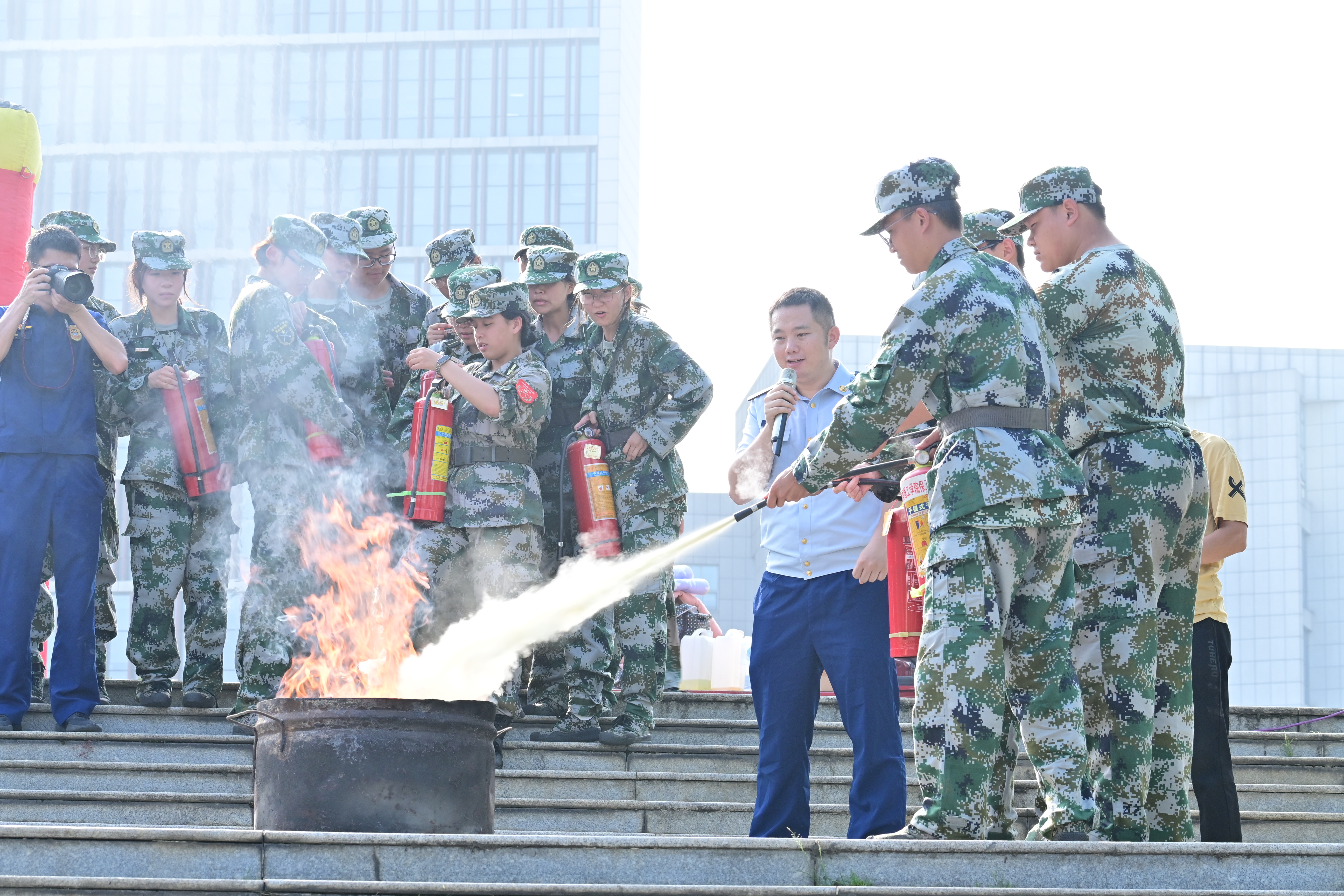 随着校园消防警报响起,保卫部模拟学生宿舍楼突发火情,学生们采取压低身姿、湿毛巾捂住口鼻等自救形方式在模拟浓烟中进行迅速、有序的疏散撤离演习。撤离到安全区域后,学生们又集中听取了市消防救援支队宣传员深度剖析了近年来高校火灾典型案例,以及日常消防设施的操作要诀,来强化大家火灾预防、初期扑救、自救要点方面的技能。演练最后,学生们又在消防救援中队的官兵们指导下,“零距离”接触灭火器灭火、浓烟逃生帐篷等灭火、自救技能体验。演练通过“实战+理论+实操”立体化模式,全面检验了学校在校园消防应急预案的可行性和师生应急逃生中的反应能力。