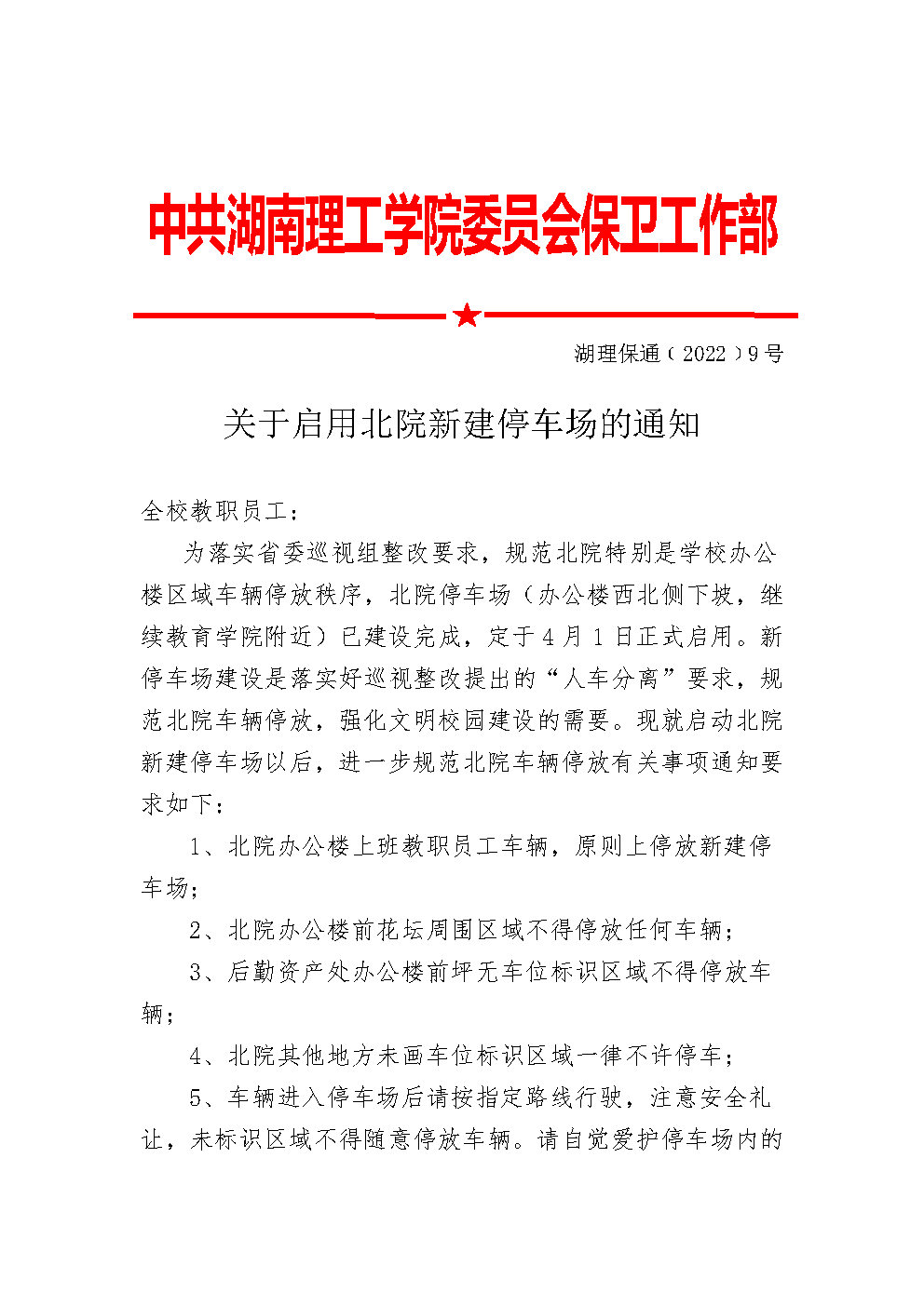 关于启用北院新建停车场的通知